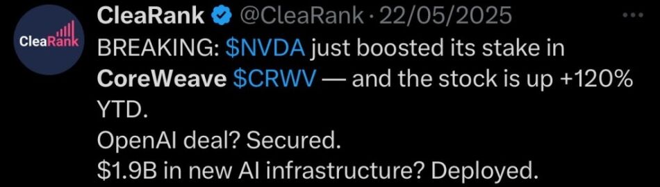 “BREAKING: $NVDA just boosted its stake in CoreWeave $CRWV and the stock is up +120 percent YTD. OpenAI deal secured. $1.9 billion in new infrastructure deployed.”