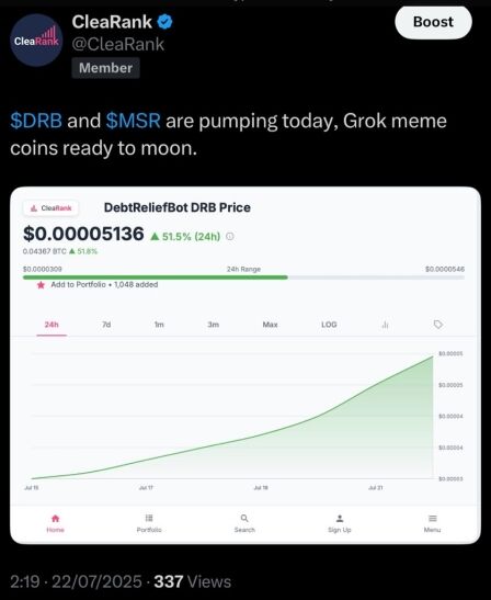 “$DRB and $MSR are pumping today, Grok meme coins ready to moon.”