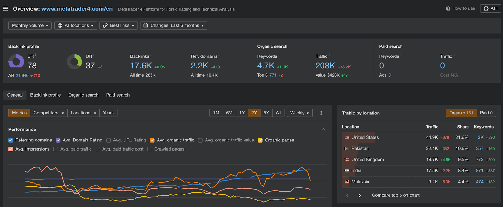To check the popularity between these two platforms, we conducted a website audit using a reputable SEO tool, Ahrefs. This immediately revealed that MetaTrader 4 (MT4) is exponentially more popular than TradeLocker: