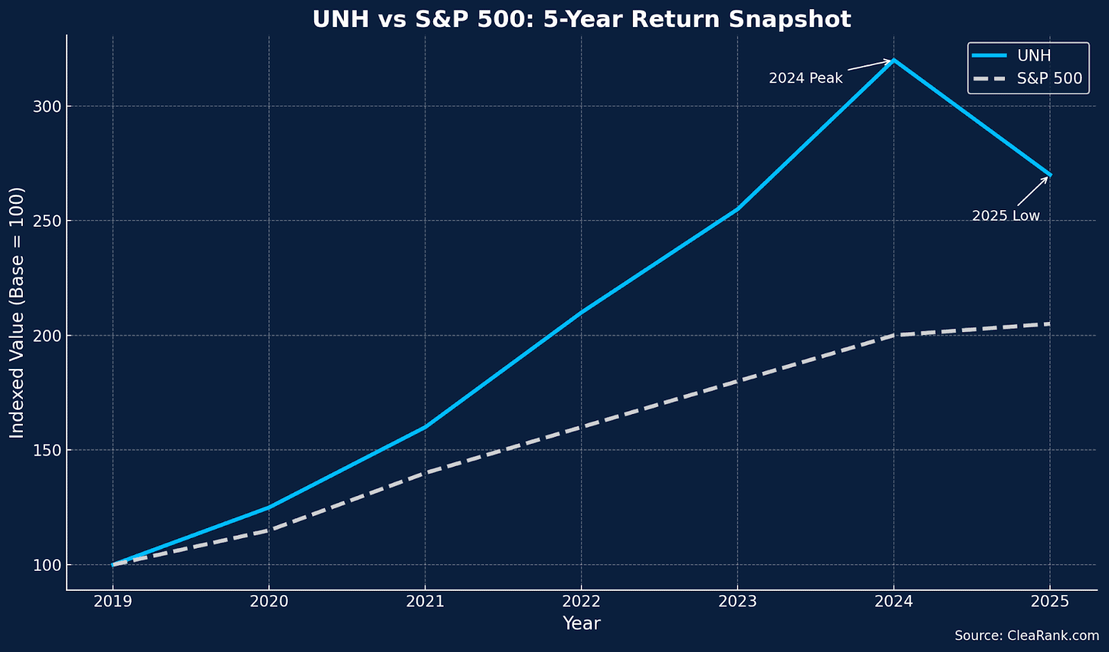 UnitedHealth Group ($UNH) — the largest health insurer in America, a market titan, and once a bulletproof stock — just plunged to a five-year low. Shares fell more than 50% from their 2024 peak and briefly touched $270 before bouncing. It’s been one of the sharpest and fastest corrections in the company’s history.